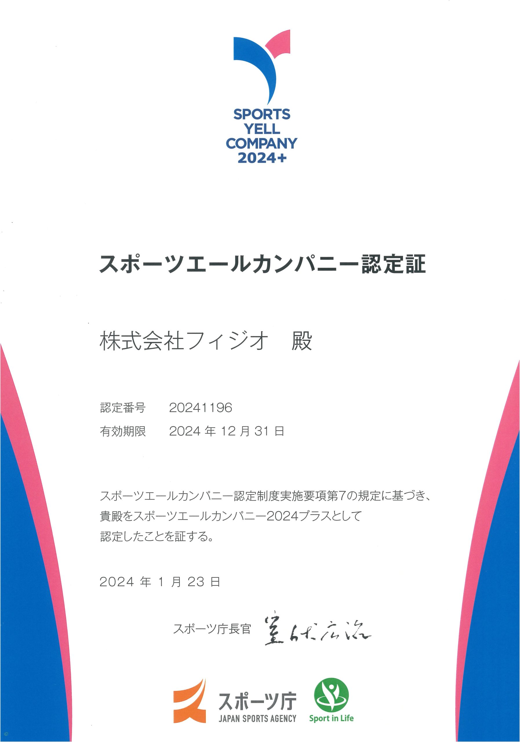フィジオ福岡を運営する株式会社フィジオは、従業員の健康増進のためにスポーツの実施に向けた積極的な取組を行っている企業として「スポーツエールカンパニー2024」として認定されました。