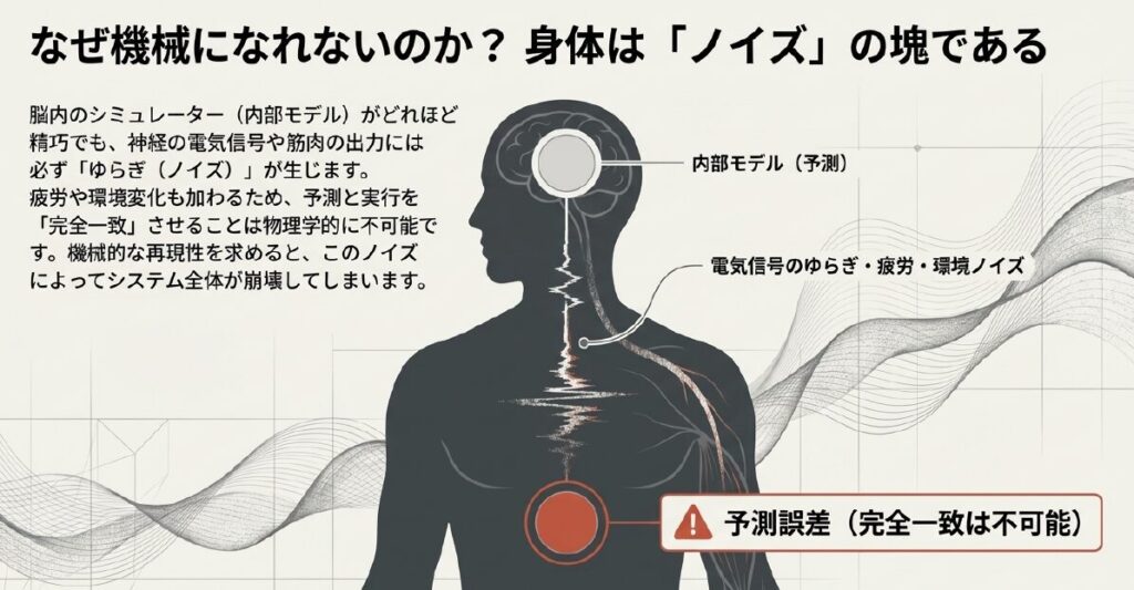 しかし、ここで一つ大きな物理的限界に直面します。私たちの身体は、本質的に「ノイズ」の塊であるということです。神経系が筋肉に送る電気信号には常にゆらぎがあり、筋肉そのものの出力にも微細な誤差が含まれます。さらに、外部環境の微妙な変化や、疲労による身体状態の変容を考慮すれば、予測と実行を「完全一致」させることは、原理的に不可能です。