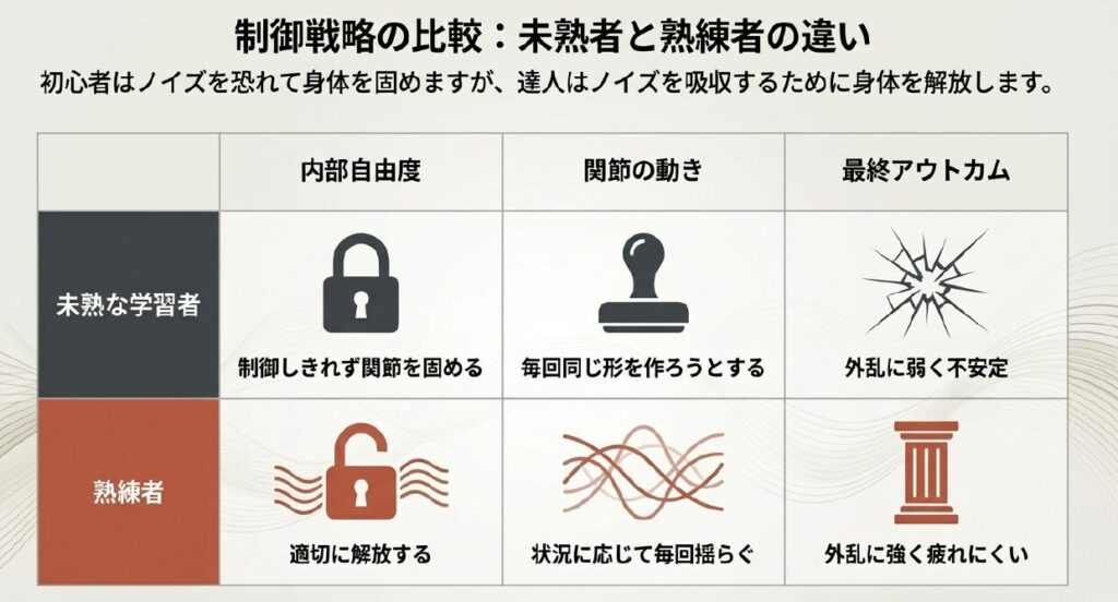 この現象を理論的に説明するのが「非制御多様体(Uncontrolled Manifold: UCM)仮説」です。私たちの体には、一つの目的を達成するために無数の関節の組み合わせが存在します。これを「自由度の冗長性」と呼びます。未熟な学習者は、この自由度を制御しきれずに関節を固めてしまいがちですが、熟練者は違います。