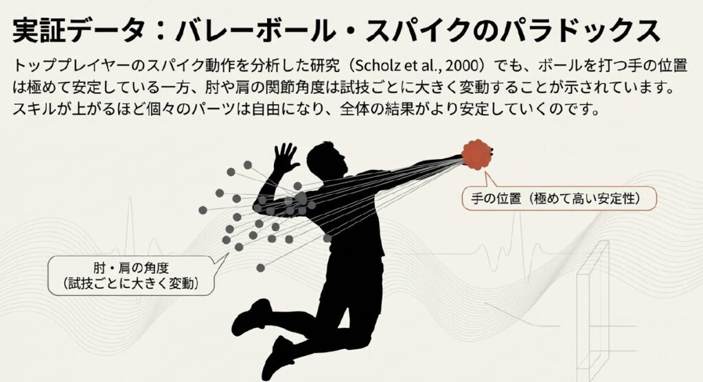 海外の研究、例えばバレーボールのトッププレイヤーのアタック動作を分析した論文(Scholz.2000)でも、ボールを打つ手の位置の安定性に対し、肘や肩の関節角度は試技ごとに大きく変動していることが示されています。熟練すればするほど、個々のパーツの動きは自由になり、全体の結果としての安定性が増していく。これは、私たちが直感的に抱く「熟練=型への固執」というイメージとは正反対のパラドックスです。