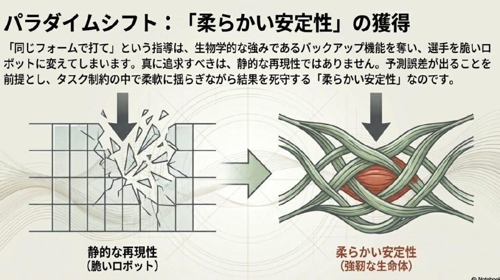 「同じフォームで打て」という指導は、時にこの縮退という生物学的強みを奪い、選手を脆く、壊れやすいロボットに変えてしまう危険性を孕んでいます。真に追求すべきは、静的な「再現性」ではなく、タスク制約の範囲内で柔軟に揺らぎながら、最終的なアウトカムを死守する「柔らかい安定性」です。