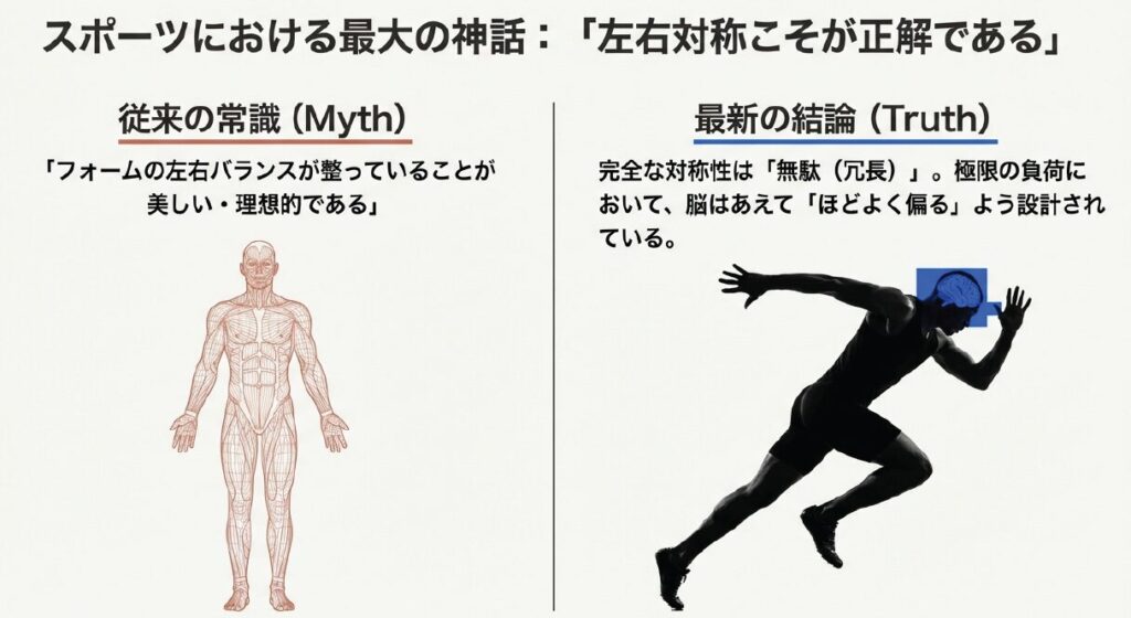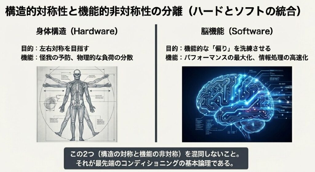 「左右のバランスを整えなさい」というアドバイスは、身体の構造的な歪みを正す意味では正しいかもしれません。しかし、その内部で駆動する計算機としての脳に目を向ければ、目指すべきは「機能的な偏り」の洗練にあります。