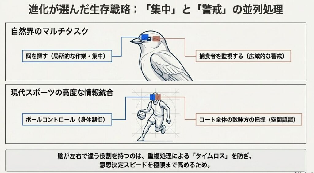 この進化の恩恵を最も象徴するのが、自然界における「並列処理」の構図です。鳥類や魚類の行動観察では、一方の半球で餌を探すという「局所的な作業」に集中しつつ、同時にもう一方の半球で捕食者の接近を監視するという「広域的なバックグラウンド・モニタ」としての機能を使い分けていることが示唆されています。この「集中と警戒」の同時並行こそが、生存競争を勝ち抜くための鍵でした。そしてこの仕組みは、現代の私たちが複雑なスポーツの試合中に、ボールをコントロールしながら同時にコート全体の敵味方の配置を把握する、あの高度なマルチタスク能力の礎となっているのです。
