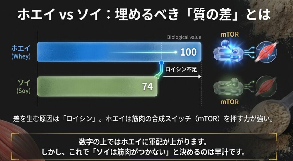 さて、次に議論の的となるのが「筋肉のつきやすさ」についてです。確かに、たんぱく質の質を評価するバイオロジカル・バリュー(生物価)という指標で見ると、ホエイプロテインが約100であるのに対し、ソイプロテインは約74と、数字の上では軍配はホエイに上がります。この差を生んでいる主犯格は「ロイシン」というアミノ酸の含有量です。ロイシンは筋肉の合成スイッチであるmTOR(エムトール)経路をダイレクトに刺激する、いわば司令官のような存在です。ホエイにはこのロイシンが豊富に含まれているため、トレーニング直後の筋タンパク合成を爆発的に高める能力に優れているのは事実です。