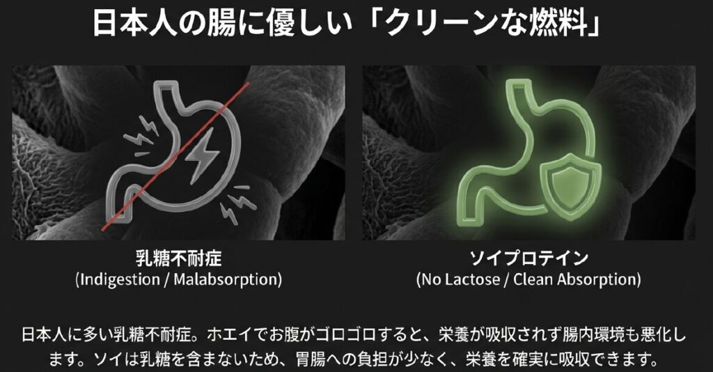 さらに、日本人に多い「乳糖不耐症」の方にとっても、ソイプロテインは救世主といえる存在です。牛乳を飲むとお腹がゴロゴロしてしまう人がホエイを飲むと、せっかくの栄養が吸収されずに体外へ排出されてしまうばかりか、腸内環境を荒らしてしまう原因にもなります。その点、大豆由来のソイプロテインなら、胃腸への負担を抑えながらクリーンにたんぱく質を補給できます。さらに大豆に含まれるサポニンやレシチンは、コレステロール値の改善や抗酸化作用といった健康面でのボーナスまで提供してくれます。