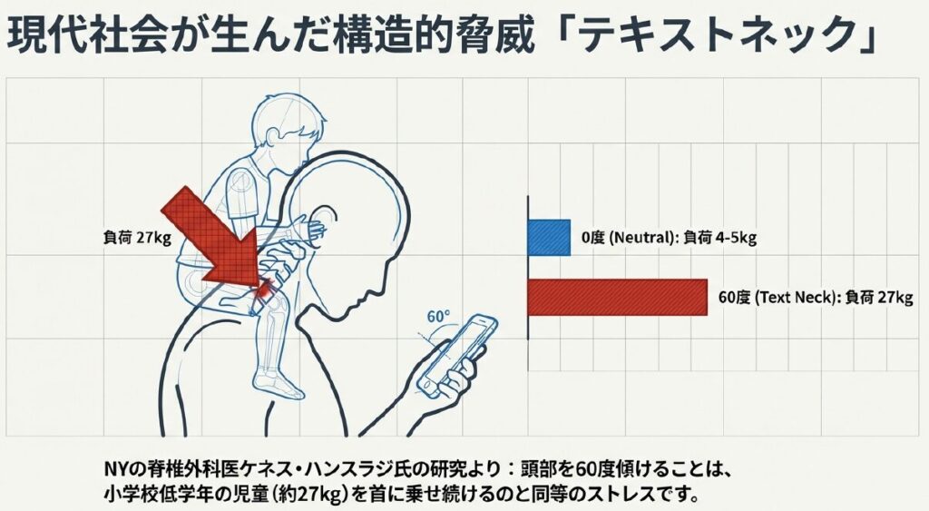 その筆頭が、私たちが日常的に手にするデバイスが生み出した「テキストネック」という現象です。ニューヨークの脊椎外科医ケネス・ハンスラジ氏の研究によれば、頭部をわずか60度前方に傾けるだけで、頚椎には約27キログラムもの負荷がかかると報告されています。これは小学校低学年の児童を一人、首に乗せ続けているのと同等のストレスであり、この過剰な負荷が頚椎の生理的前弯を消失させ、いわゆるストレートネックを引き起こす引き金となります。このアライメントの崩れは、単に首の痛みにとどまらず、脊椎全体の連鎖を狂わせ、結果として腰椎の過前弯や胸椎の過後弯といった代償動作を強制することになるのです。