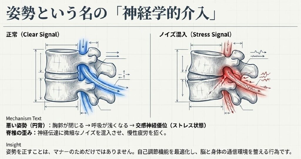 さらに、脊椎の状態は私たちの精神や自律神経系とも密接にリンクしています。脊髄から枝分かれする神経根は、椎間孔という狭い隙間を通って全身へと伸びていますが、アライメントの崩れや筋の過緊張は、これらの神経伝達に微細なノイズを混入させます。胸郭が閉じた円背姿勢は、横隔膜の動きを制限して呼吸を浅くし、交感神経を優位にさせ、慢性的な疲労感やストレス感受性の増大を招くことが示唆されています。姿勢を正すという行為が、単なるマナーや見栄えの問題ではなく、自己調節機能を最適化するための「神経学的介入」であるとされる所以はここにあります。これからの時代、脊椎の健康を守るためには、日常の中での「中立(ニュートラル)」への回帰が鍵となります。それは、耳の穴、肩の峰、股関節の大転子、膝、くるぶしが一直線上に並ぶ、重力が最も味方をしてくれるポジションを見つける旅でもあります。私たちは一日の大半を椅子に座って過ごしますが、このとき骨盤の坐骨結節で正しく体重を受け、脊椎のS字を維持することは、椎間板への内圧を劇的に減少させます。デスクワークの合間に胸椎を伸展させ、縮こまった大胸筋を解放し、失われた頚椎のカーブを意識的に取り戻すリセット作業は、まさに脊椎という精密機械のメンテナンスに他なりません。