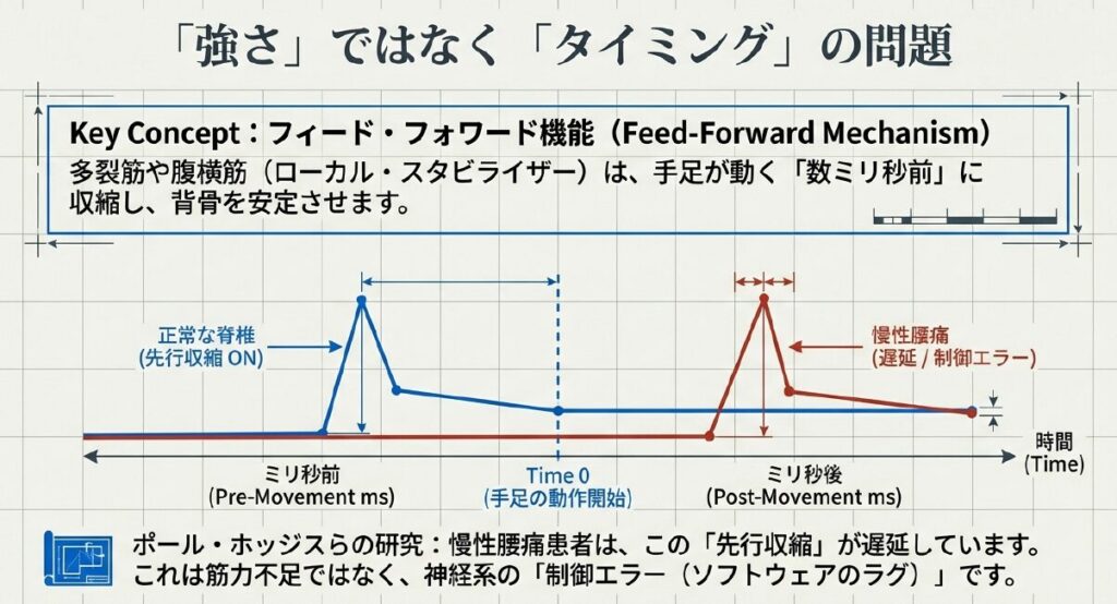 脊椎の安定性を語る上で欠かせないのが、マノハール・パンジャビ博士が提唱した「脊椎安定化システム」の概念です。彼は脊椎の安定を「受動的」「能動的」「神経的」という三つのサブシステムの相互作用として定義しました。骨や靱帯が担う受動的な支えだけでなく、筋肉による能動的な制御、そしてそれらを統括する神経系のフィードバックが完璧に調和して初めて、私たちは重力下で自由自在に動くことができるのです。特に興味深いのは、多裂筋や腹横筋といった深層筋群の役割です。これらは「ローカル・スタビライザー」と呼ばれ、運動が始まる数ミリ秒前に先行して収縮し、脊椎の分節的な安定を確保するという「フィード・フォワード」機能を持っています。ポール・ホッジスらの研究によれば、慢性的な腰痛を抱える患者はこの先行収縮のタイミングが遅延していることが分かっており、これは筋肉の「強さ」の問題ではなく、神経系の「制御」の問題であることを示唆しています。つまり、脊椎の健康を維持するためには、単に筋力を鍛えるのではなく、脳が身体のパーツをどう認識し、どう動かすかという「身体知」を再構築する必要があるのです。