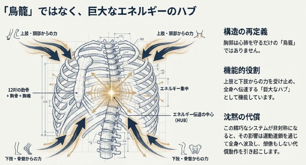 私たちは身体の不調を感じる際、どうしても痛みが生じている局所に目を奪われがちですが、実はその背後で「沈黙の支配者」として全身の動きをコントロールしているのが胸椎と胸郭のアライメントです。脊柱の中でも胸椎は、頚椎のしなやかさや腰椎の力強さに隠れ、どこか地味な存在に思われがちですが、解剖学的な視点に立てば、これほどダイナミックかつ繊細な役割を担っている部位は他にありません。十二対の肋骨と胸骨、そして胸椎が構成する「胸郭」という鳥籠のような構造体は、単に心肺を保護する器ではなく、全身のエネルギーを伝達する巨大なハブとして機能しています。しかし、この完璧に設計されたはずのシステムがひとたび非対称性を帯びると、その影響は運動連鎖を通じて全身へと波及し、私たちが想像もしないような代償動作を引き起こします。