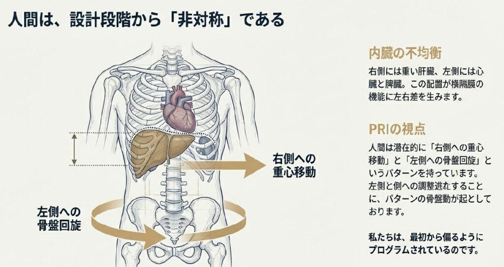 ここで興味深いのは、人間という生物がそもそも内部構造からして非対称であるという事実です。右側には巨大な肝臓が鎮座し、左側には心臓と脾臓が位置する。この内臓の不均衡は、横隔膜の形状や機能にも左右差をもたらし、結果として呼吸パターンや体幹の回旋特性に一定の偏りを与えます。例えば、理学療法の世界で注目されるPRI(ポスト・リハビリテーション・インスティテュート)の理論では、多くの人間が「右側への重心移動と左側への骨盤回旋」というパターンを潜在的に保持していると指摘されています。こうした生理的な左右差に、右利き社会における生活習慣や特定のスポーツ動作が加わると、胸郭は容易にそのバランスを崩していきます。右利きの動作で右上肢を多用すれば、右側の前胸部にある大胸筋や肋間筋は短縮しやすく、逆に左側の前鋸筋や腹斜筋は引き延ばされた状態で固定されがちです。このような筋機能のアンバランスは、単なる筋肉の硬さの問題に留まらず、胸椎の「カップリング・モーション」と呼ばれる特性によって、回旋と側屈が複雑に絡み合った三次元的な歪みへと発展していきます。