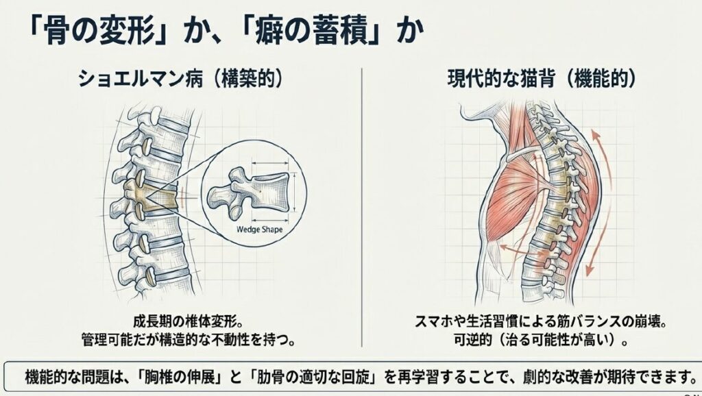 また、成長期における構築的疾患であるショエルマン病についても触れておく必要があります。これは椎体の終板障害によって胸椎が前弯変形を起こす疾患ですが、この既往を持つ選手は、成人後も慢性的な胸椎の不動性に悩まされることが少なくありません。こうした構造的な問題を抱える場合でも、機能的なトレーニングによって周辺の筋バランスを整え、肋椎関節のモビリティを確保することは十分に可能です。一方で、現代人に多い「機能的な猫背」は、ショエルマン病のような骨の変形ではなく、主に長時間のスマートフォン使用や筋不均衡によるものです。スイマーに胸椎後弯が多いのも、水流の抵抗に抗うための肩甲帯の安定化と、反復的な腕のストロークが胸郭前方部を引き締め、後方を引き延ばしてしまうためです。これらは適切な介入、つまり「胸椎の伸展」だけでなく「肋骨の適切な内旋・外旋」を学習することで、劇的に改善する可能性を秘めています。