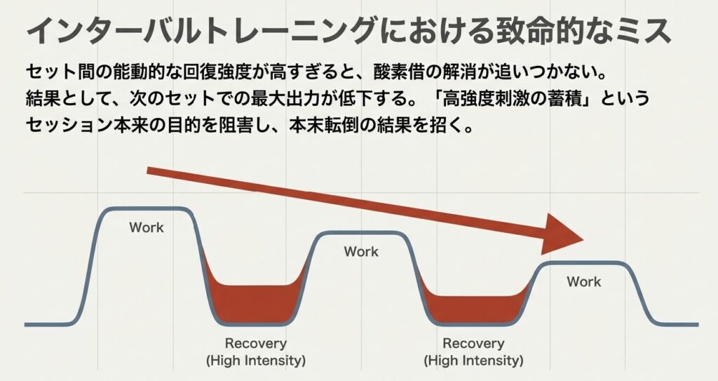 特にインターバルトレーニングのセット間におけるリカバリー設定には、細心の注意が求められます。セット間の能動的な回復強度が高すぎると、酸素借の解消が追いつかず、次のセットでの最大出力が低下してしまいます。これではセッション全体の目的である「高強度刺激の蓄積」を阻害してしまい、本末転倒の結果を招きかねません。また、週単位のトレーニングボリュームを管理する上でも、アクティブリカバリーを「ゼロ負荷の休息」と見なすのは危険です。心血管系や自律神経系にとっては、LT近傍の運動は決して無視できないストレスであり、オーバーリーチングの状態にある選手が「回復のため」と称して高強度のリカバリーを繰り返せば、慢性疲労の泥沼に足を踏み入れることになります。