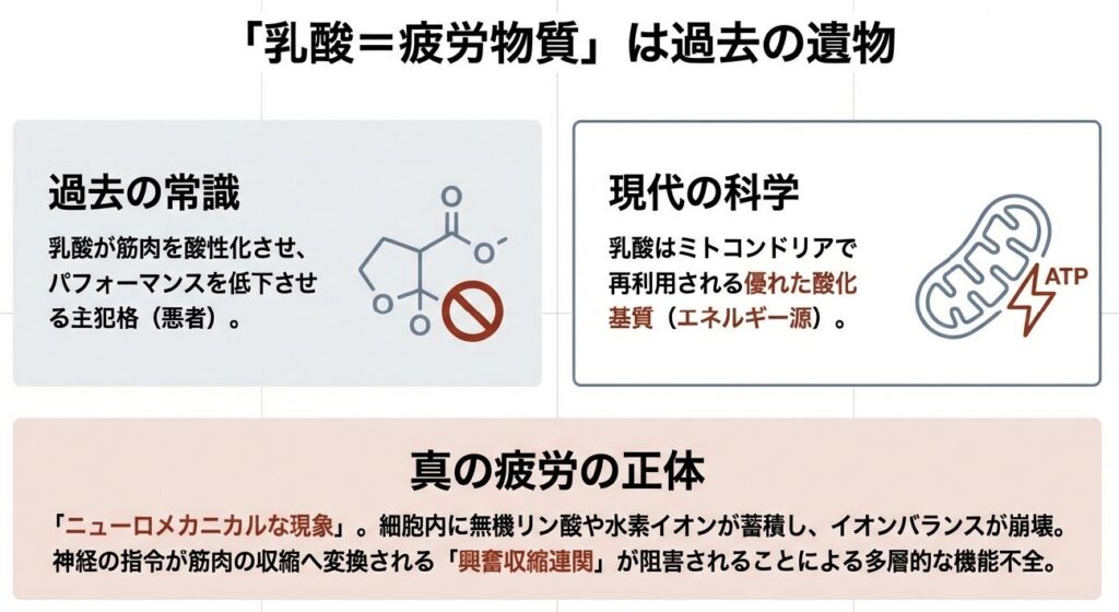 まず、私たちが「疲労」と呼ぶ現象の正体を、現代的な視点で整理しておく必要があります。かつての生理学では、乳酸が筋肉を酸性化させ、パフォーマンスを低下させる主犯格だと考えられてきました。しかし、現在では乳酸は「悪者」どころか、ミトコンドリアで再利用される優れた酸化基質、つまりエネルギー源としての側面が強調されています。いわゆる「乳酸=疲労物質」という図式はもはや過去の遺物であり、真の疲労は「ニューロメカニカルな現象」、すなわち末梢の筋組織と中枢神経系の両面から生じる多層的なプロセスとして理解されています。細胞内では無機リン酸や水素イオンが蓄積し、イオンバランスが崩れることで、神経の指令が筋肉の収縮へと変換される「興奮収縮連関」が阻害されます。この複雑な機能不全をいかに効率よくリセットするかが、リカバリーの真髄と言えるでしょう。