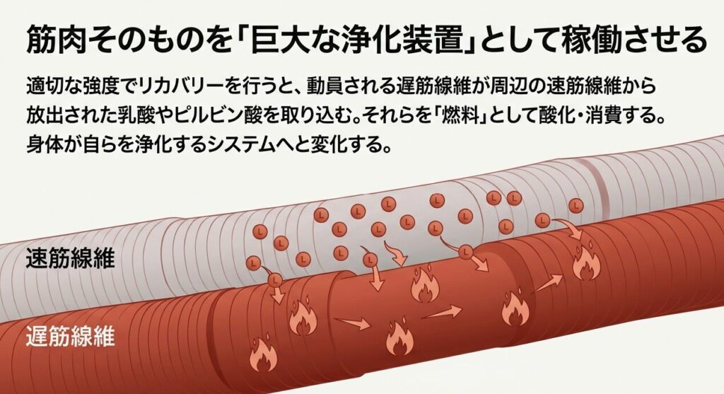 ここで興味深いのは、リカバリー中の強度が適切であれば、動員される遅筋線維が、周辺の速筋線維から放出された乳酸やピルビン酸を「燃料」として取り込み、酸化させてしまう点です。つまり、アクティブリカバリーとは、ただ血流を良くするだけでなく、筋肉そのものを「巨大な浄化装置」として稼働させるプロセスなのです。