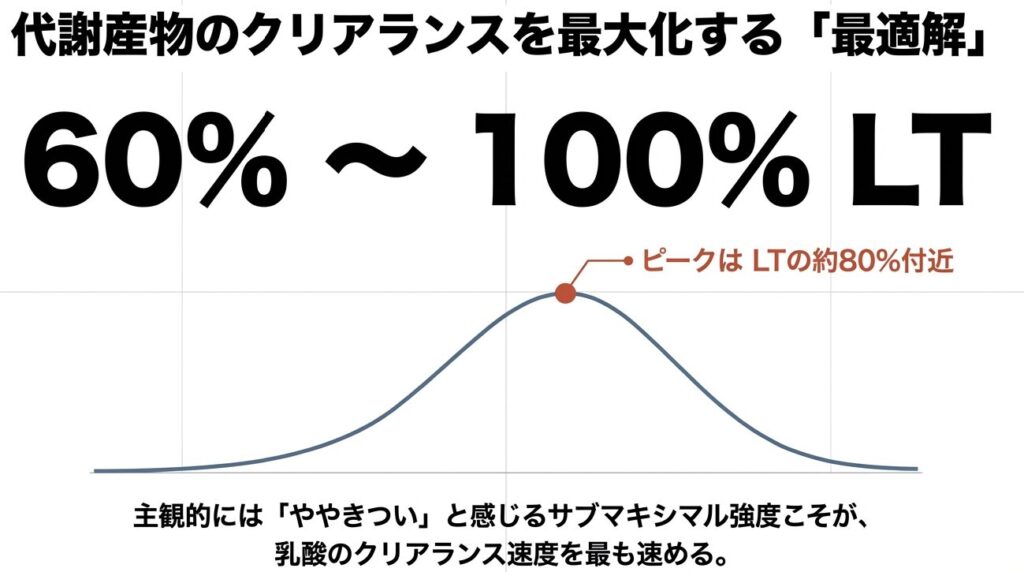 しかし、ここで多くの指導者やアスリートが陥りやすい罠があります。それは「リカバリー強度の設定」です。従来は「ごく軽いジョギングやサイクリング」が推奨されてきましたが、最新の研究データはより踏み込んだ結論を提示しています。複数のシステマティックレビューによれば、代謝産物のクリアランスを最大化させるのは、実は乳酸閾値(LT)の60%から100%という、意外にも「ややきつい」と感じるサブマキシマル強度なのです。特にLTの約80%付近での運動は、乳酸のクリアランス速度が最も速いことが報告されています。