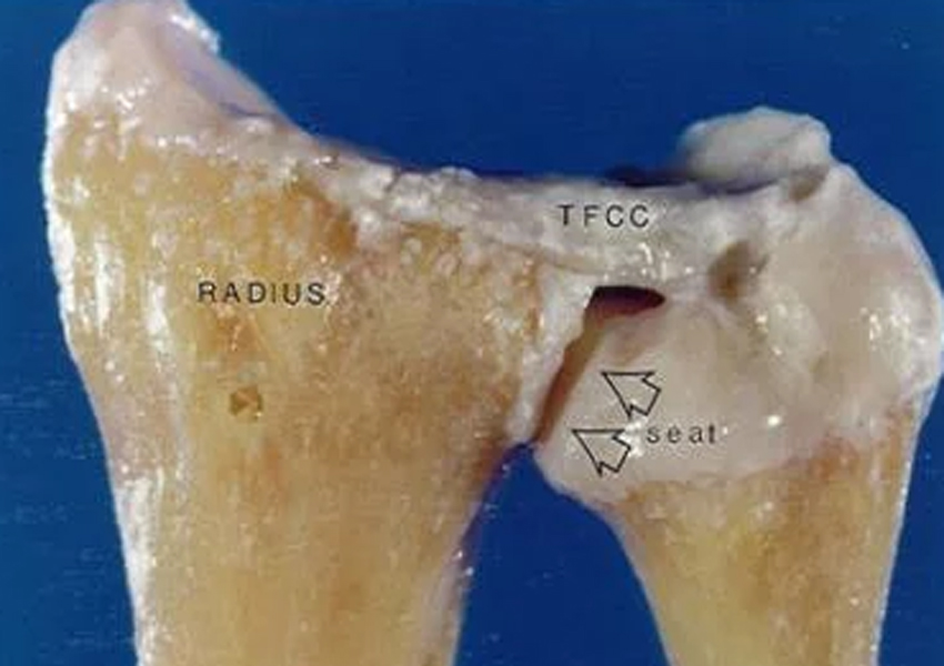 TFCCは手関節尺側の橈骨・尺骨・月状骨・三角骨にある靭帯と線維軟骨の複合体になります。TFCCの構成要素は三角線維軟骨・メニスカス類似体・掌背側橈尺靭帯・尺骨月状骨靭帯・尺骨三角骨靭帯・尺側手根伸筋腱腱鞘床などでされます。