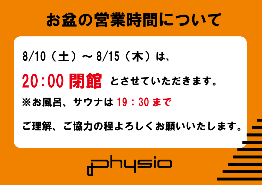 いつもフィジオ福岡をご利用いただき、誠にありがとうございます! 8月の営業時間のお知らせをさせていただきます。